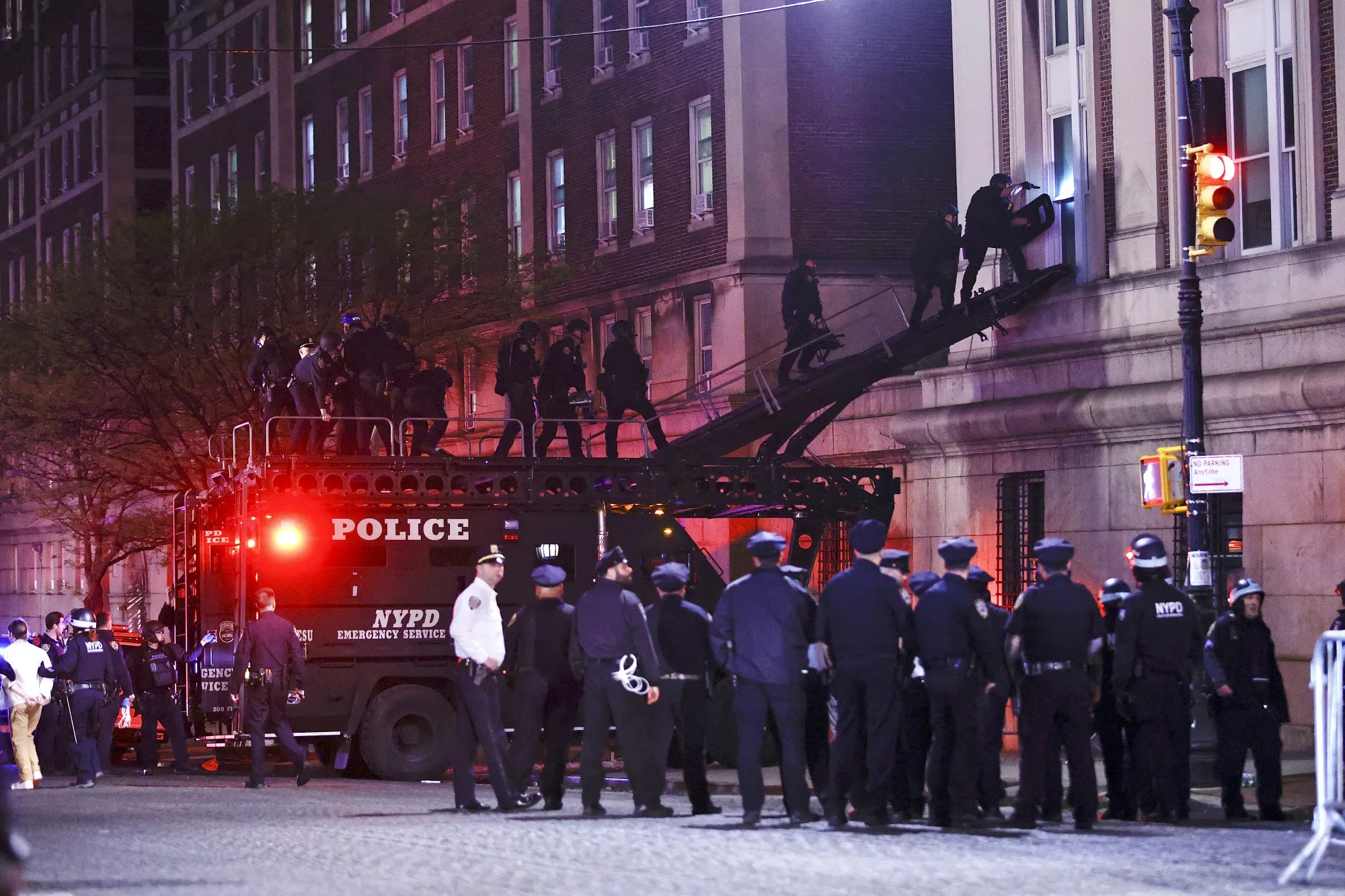纽约警察局的警官在哥伦比亚大学。摄影师:Kena Betancur/法新社通过Getty Images在示威者占领哥伦比亚大学的一栋建筑后,学校叫来了纽约警察局。在洛杉矶,警方 关闭了加州大学洛杉矶分校的营地,因为亲巴勒斯坦的抗议者遭到反对示威者的攻击,导致了一场造成十多人受伤的混战。