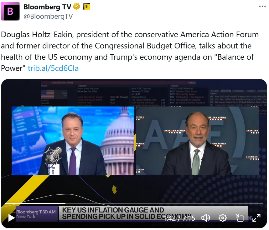 今天在彭博电视台的 权力平衡 早间版中,主持人乔·马修和凯莉·莱因茨采访了保守派美国行动论坛的主席、前国会预算办公室主任道格拉斯·霍尔茨-艾金,讨论美国经济的健康状况和特朗普的经济议程。