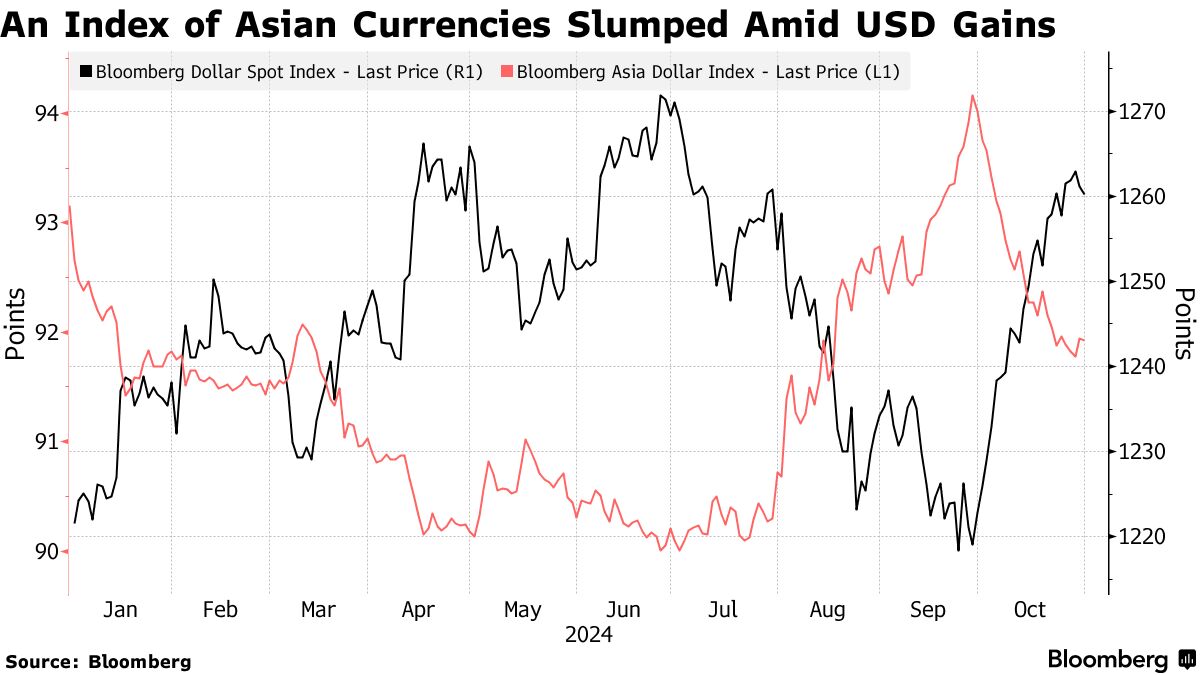 10月份,亚洲货币承压,唐纳德·特朗普总统的胜算上升以及对美联储放松政策步伐的不确定性推动了美元走强。彭博社的一个地区货币指数刚刚经历了自2023年2月以来的最糟糕月份,印度卢比接近历史最低点,韩国的韩元接近三个月低点。