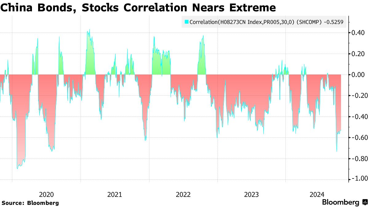“越来越多的交易者在观察股票,以决定如何交易债券,”中国券商Topsperity Securities的首席固定收益分析师吕品表示。“最近两者之间的相关性变得如此接近,以至于这两种资产的走势联系甚至可以缩短到几分钟,这很少见。”