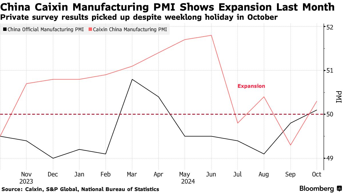 官方和财新数据是中国在大幅降息和推出措施以支持房地产市场后,首次提供经济快照的报告。这些努力表明北京有意在今年实现约5%的增长目标,并促使股市反弹。投资者现在预计将在下周的立法会议上宣布进一步的财政支持。
