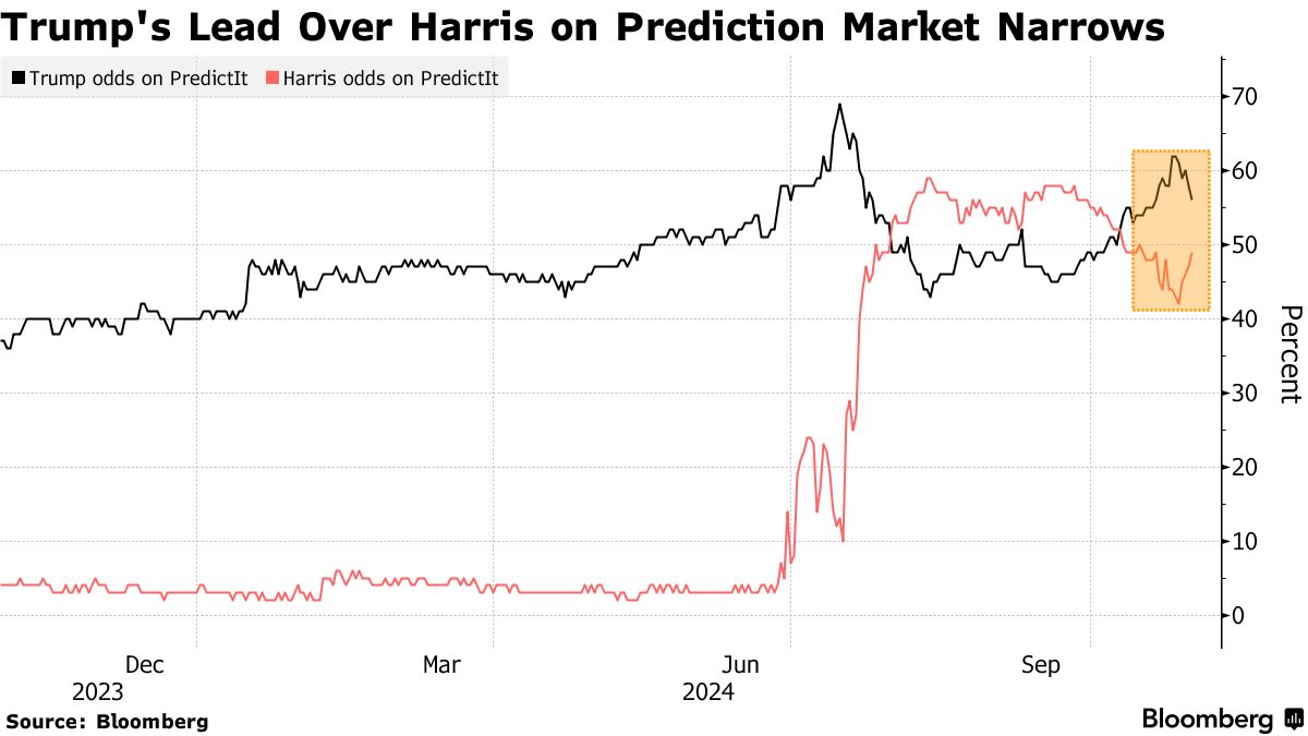 这项数字资产在周五亚洲交易中跌破69,000美元,此前在美国下滑了4%——这是一个月以来的最大跌幅。此次回落与特朗普在PredictIt、Polymarket和Kalshi上对民主党候选人副总统卡马拉·哈里斯的领先优势缩小同时发生,那里人们可以对选举结果进行投注。