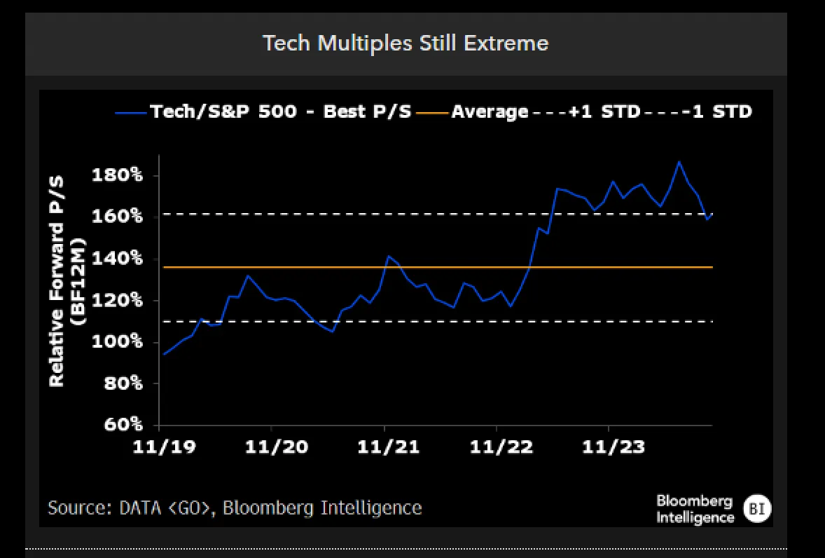 如果没有这些巨头,科技的倍数会稍微低一些,但其他科技公司无疑也在为该行业的溢价做出贡献。没有苹果、微软和英伟达,科技的前瞻性市销率为4.97倍,比行业倍数低36%,更接近标准普尔500的2.94倍。然而,从历史角度来看,这远非便宜。去掉巨头后的行业倍数比自2017年以来的平均水平高出1.5个标准差。