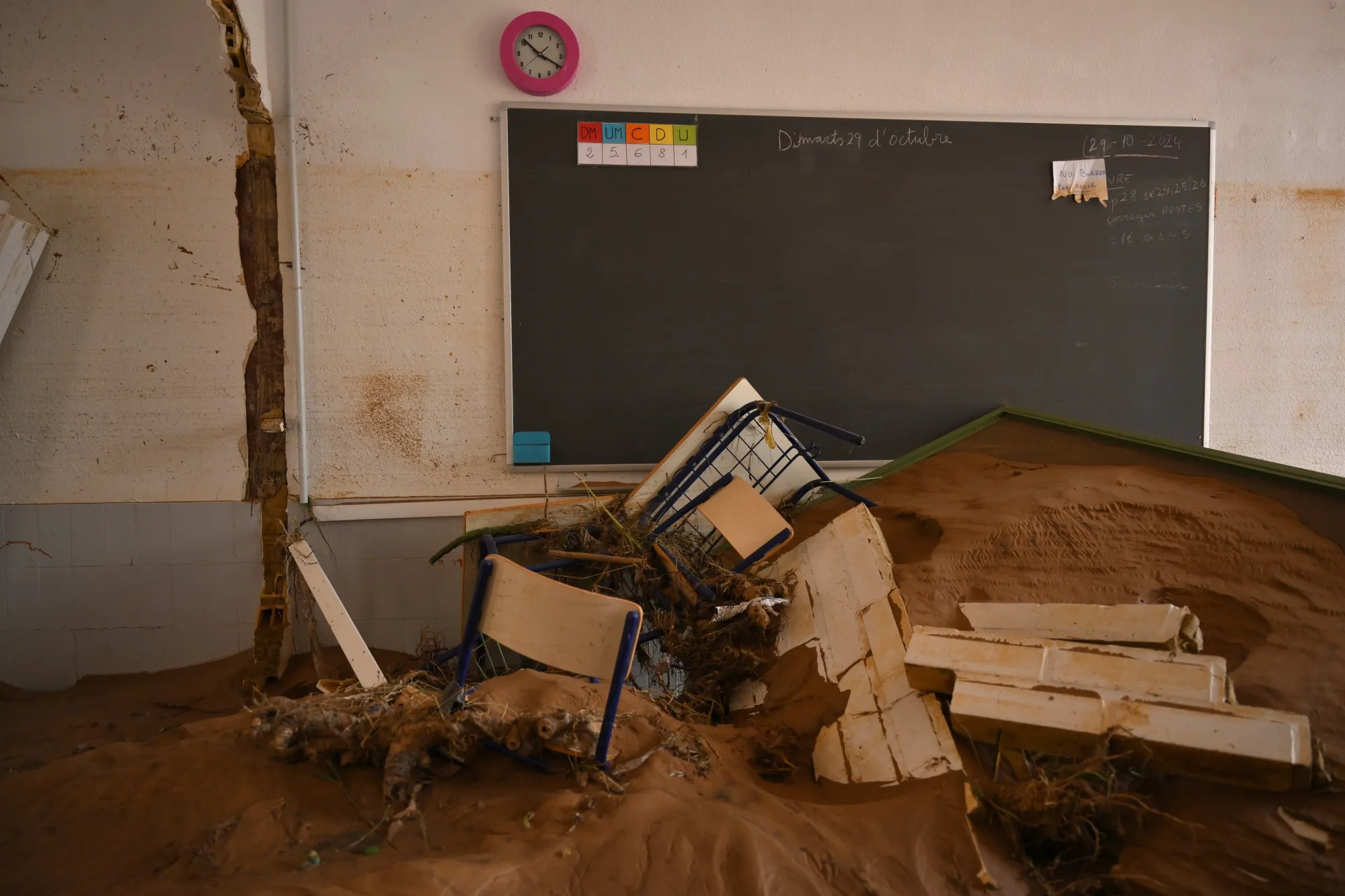 在Alfafar市闪电洪水后的教室里的碎片。摄影师:大卫·拉莫斯/Getty Images