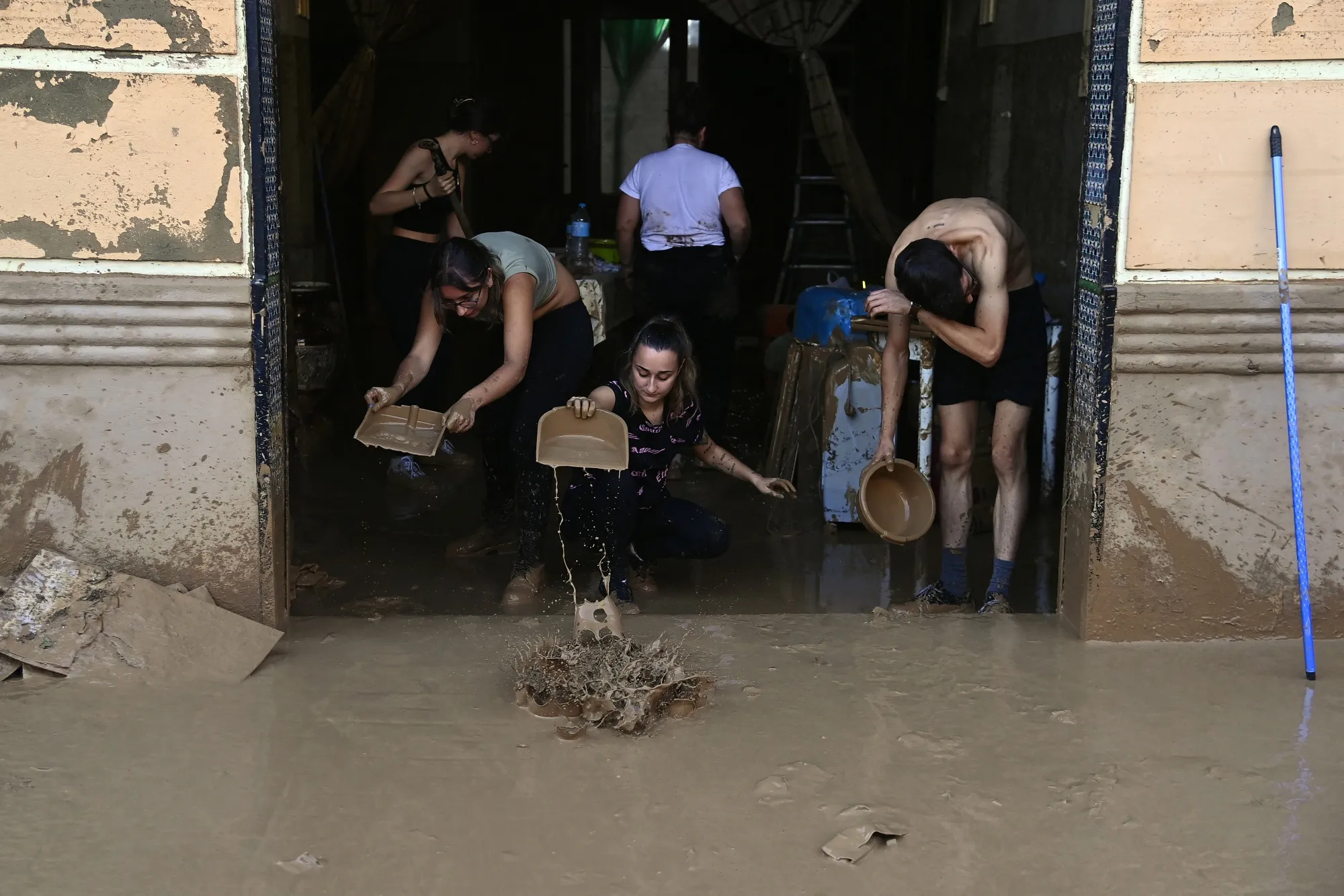 人们试图清理Paiporta一条被泥覆盖的街道。摄影师:马瑙雷·金特罗/法新社/Getty Images