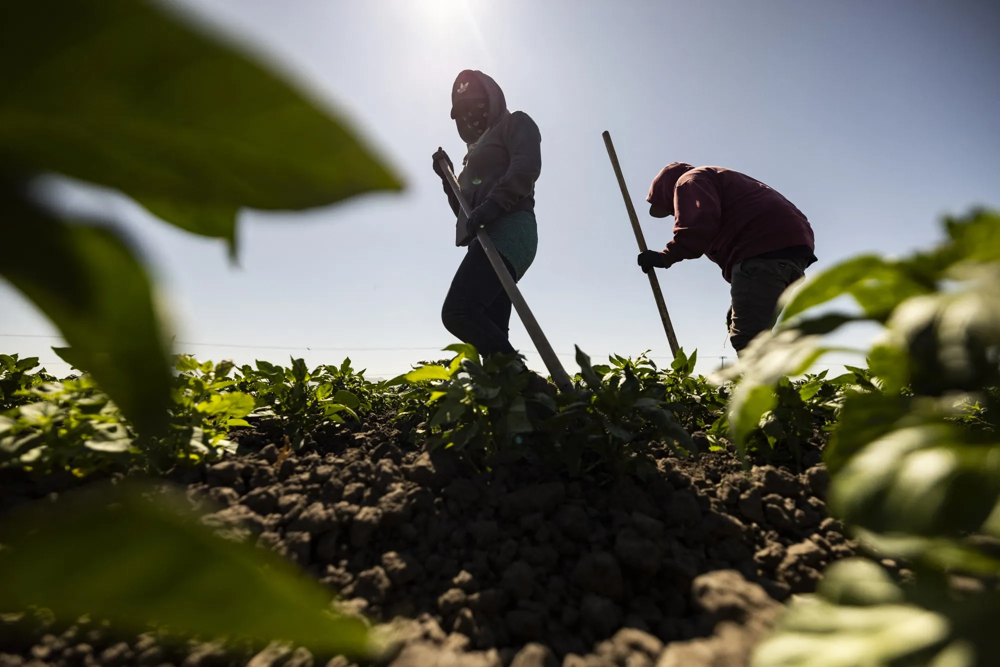农场工人在加利福尼亚州卡马里奥的甜椒田里除草,正值今年夏季热浪期间。摄影师:埃蒂安·洛朗/法新社根据2021年美国进步中心的报告,几乎有170万无证移民在食品供应链中工作。报告列出了近30万在农业和农场工作;206,000人在食品生产中,如 屠宰场和商业面包店;154,000人在杂货店和便利店;以及833,000人在餐馆。