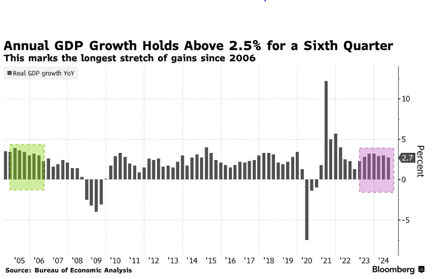 这使得上个季度的2.8%年化增长率看起来 非常火热,尤其是在第二季度的3%增速之后。亚特兰大联邦储备银行对2024年最后三个月的初步“GDPNow”跟踪估计于周四公布:另一个强劲的读数,为2.7%。