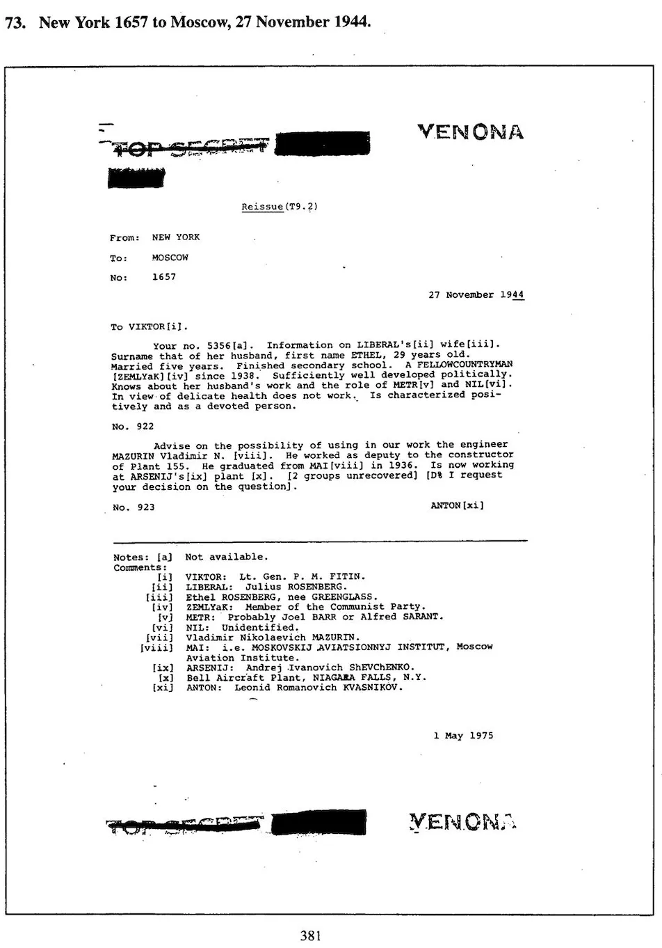 解密的打字版Venona电报中提到埃塞尔·罗森伯格的部分内容曾被发布,称她“在政治上发展得相当好”,并且“了解她丈夫的工作”。接着说“考虑到她的健康状况,无法工作。”