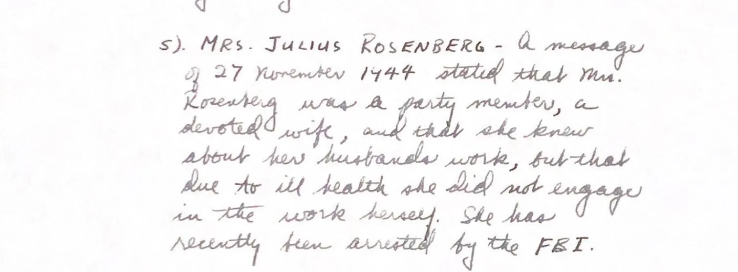 现在,关于八个字,斜体字是我的:“1944年11月27日的一条消息指出,罗森伯格夫人是党成员,是一位忠诚的妻子,并且她知道她丈夫的工作,但由于健康不佳她没有参与这项工作。她最近已被FBI逮捕。”