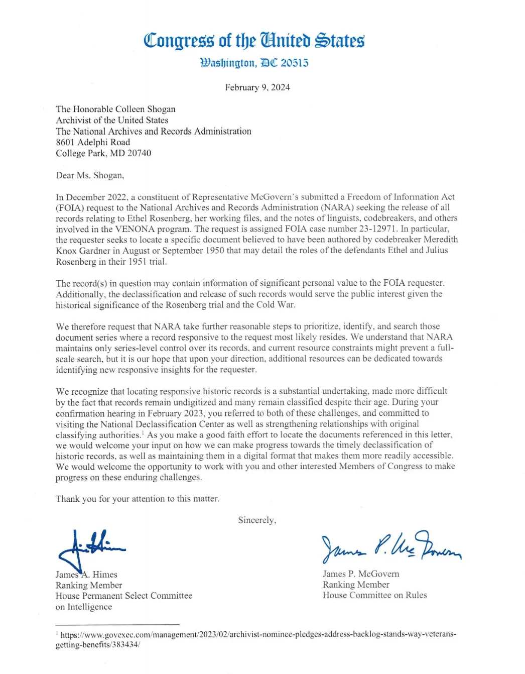 通过《信息自由法案》从国家安全局或任何情报机构获取记录是一个艰巨的过程。但梅罗波尔一家得到了民主党众议员詹姆斯·麦戈文的帮助,他是众议院规则委员会的排名成员,十年前与梅罗波尔一家见过面,并签署支持他们的事业。