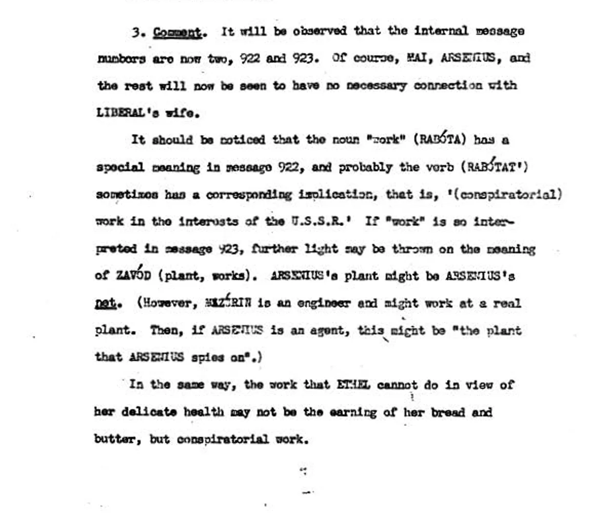 *加德纳手写备忘录所依据的先前解密的Venona电报之一。*加德纳在附加到电报的评论中解释说,“考虑到埃塞尔的健康状况,她无法进行的工作可能不是谋生的工作,而是阴谋工作。”