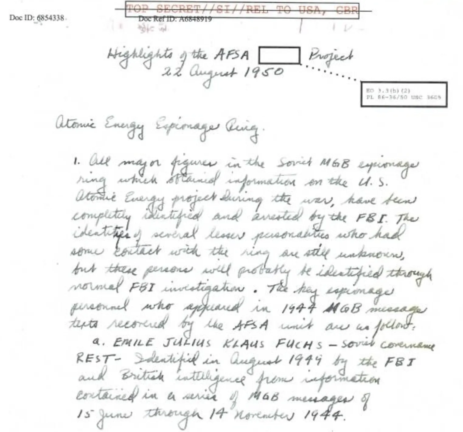 顶部写着“AFSA项目的亮点”。AFSA是武装部队安全局,是NSA的前身。值得注意的是,在这么多年之后,“AFSA”和“项目”之间的一个词仍然被编辑掉,因为它与“一个机构的内部人员规则和实践”有关,这可能基本上可以意味着任何事情。在那行下面写着“原子能间谍集团”。
