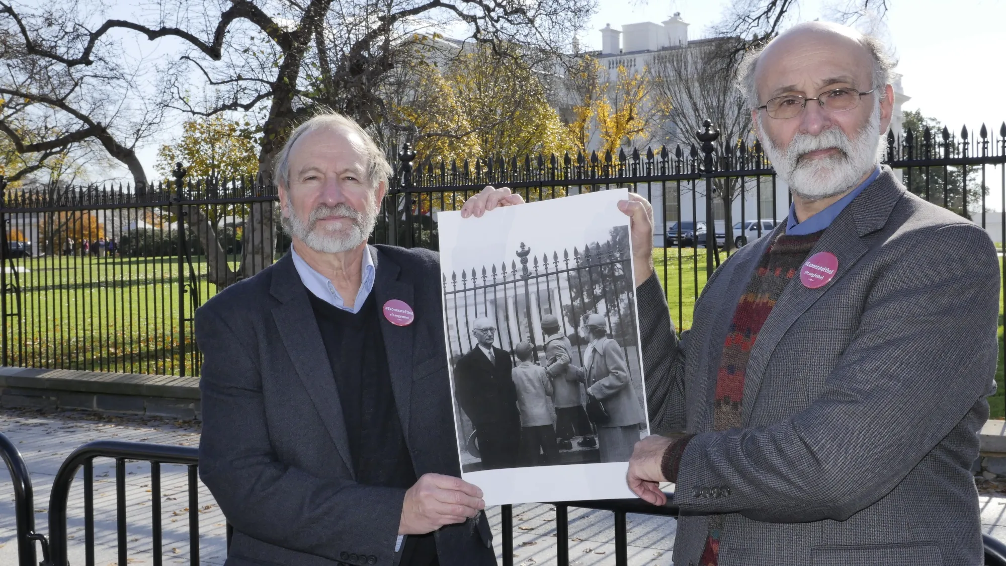 兄弟迈克尔·米尔波尔和罗伯特·米尔波尔,已被定罪的苏联间谍朱利叶斯和埃塞尔·罗森伯格的孩子,2016年12月在白宫外。