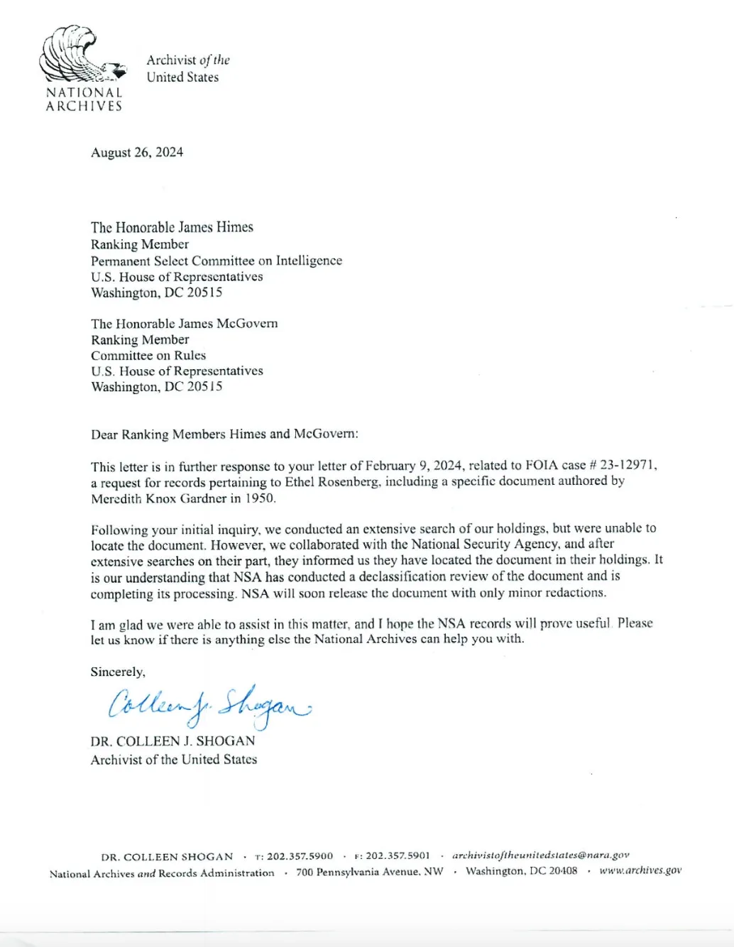 “这表明埃塞尔·罗森伯格因间谍活动而被定罪和处决是错误的,”麦戈文说。“她不是间谍。而且事情是这样的,国家安全局对此是知情的。”