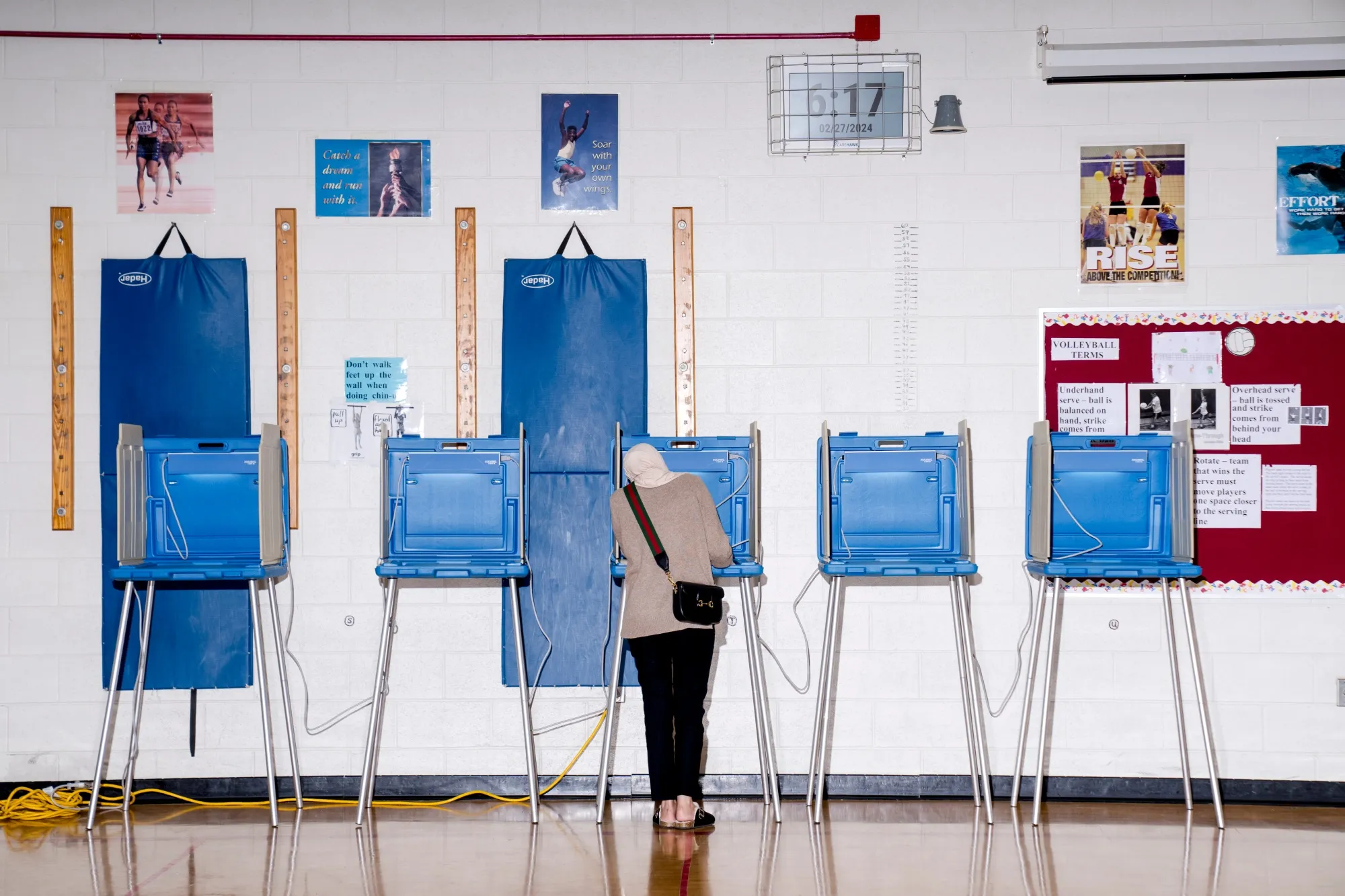 一位选民在密歇根州迪尔伯恩的投票站投票。摄影师:尼克·安塔亚/彭博社### 特朗普在密歇根州