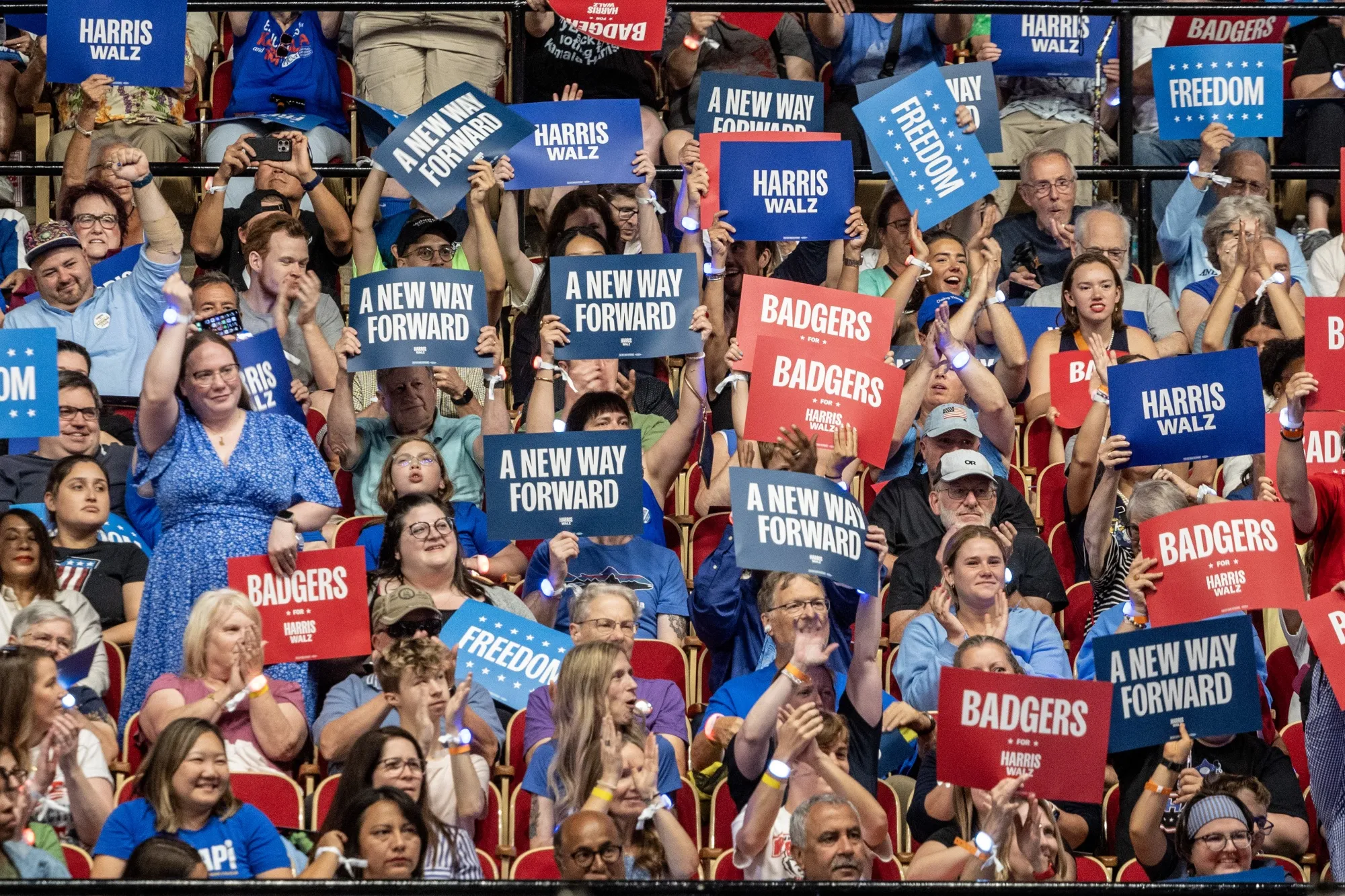 与会者在威斯康星州麦迪逊参加卡马拉·哈里斯的竞选活动时举着标语牌,时间是9月20日。摄影师:亚历克斯·沃布莱斯基/彭博社### 威斯康星州集会
