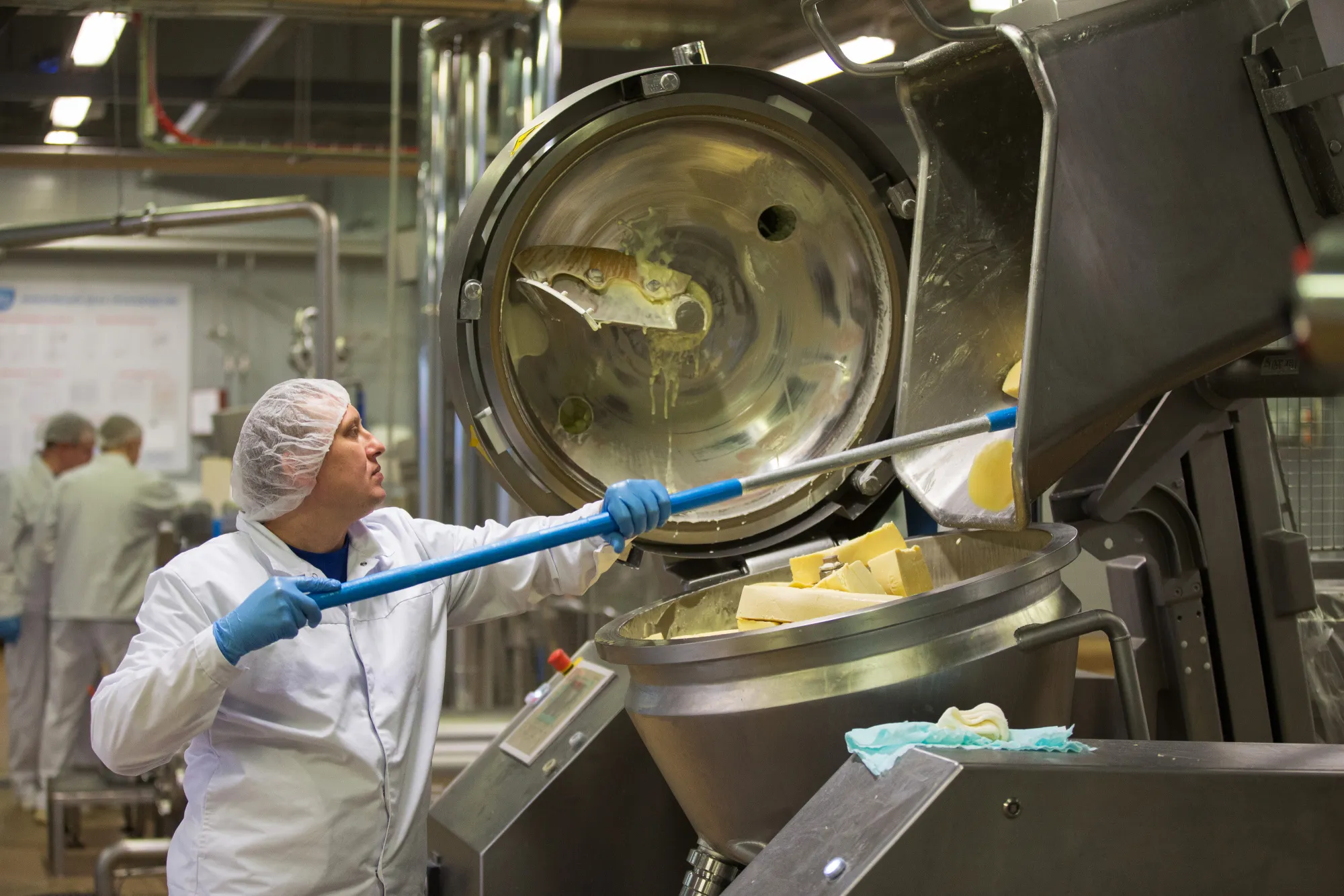 一名工人在俄罗斯叶尔绍沃的加工过程中将黄油装入机器。