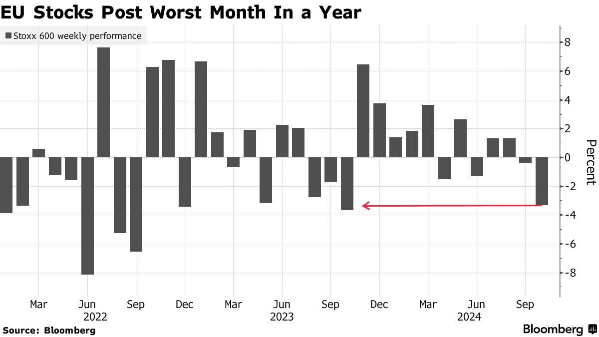 欧洲股市在10月份录得一年以来最大月度跌幅,因一系列令人沮丧的企业财报引发了对经济前景的担忧。市场还关注美国大选和下周美联储的会议,以寻找利率前景的线索。