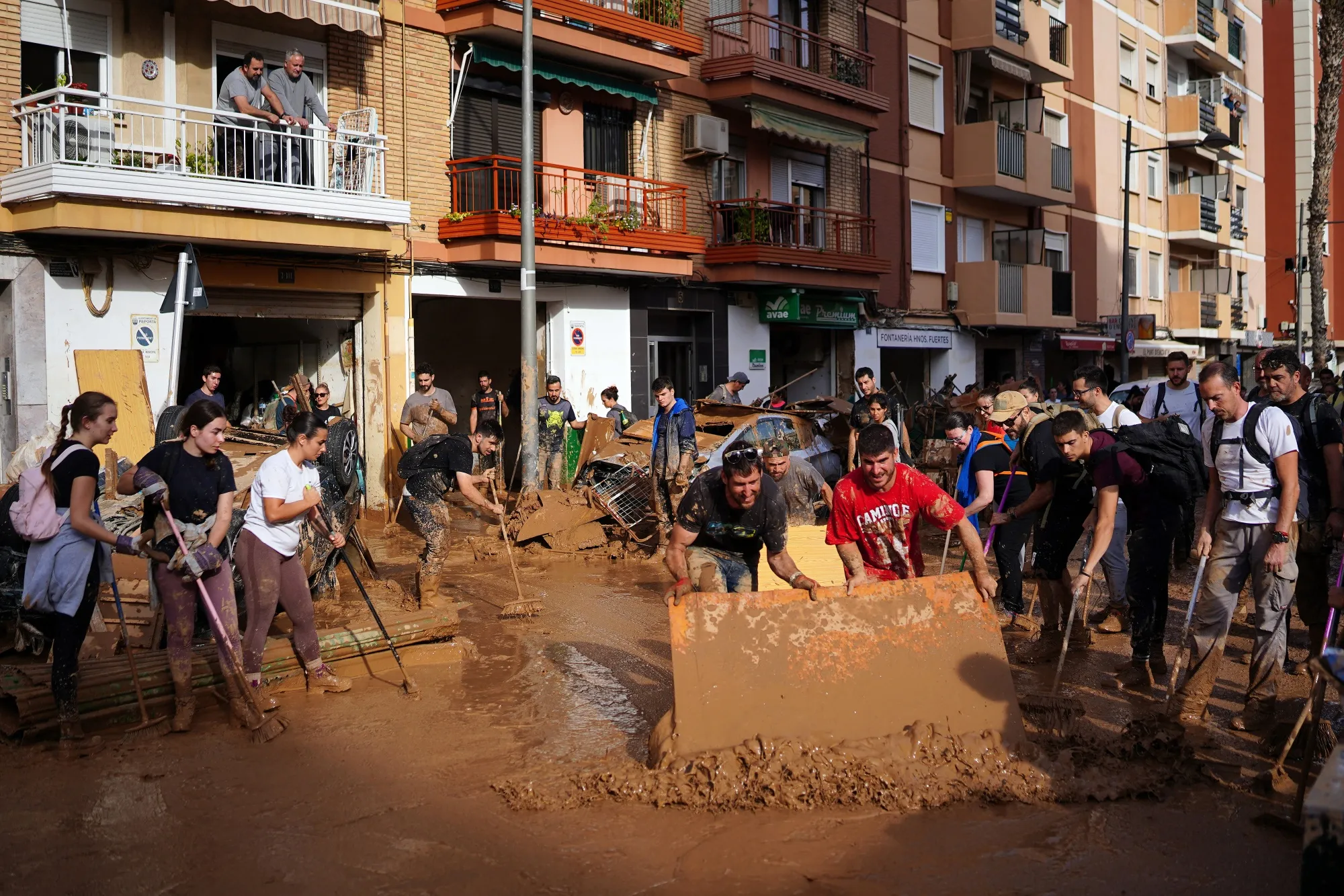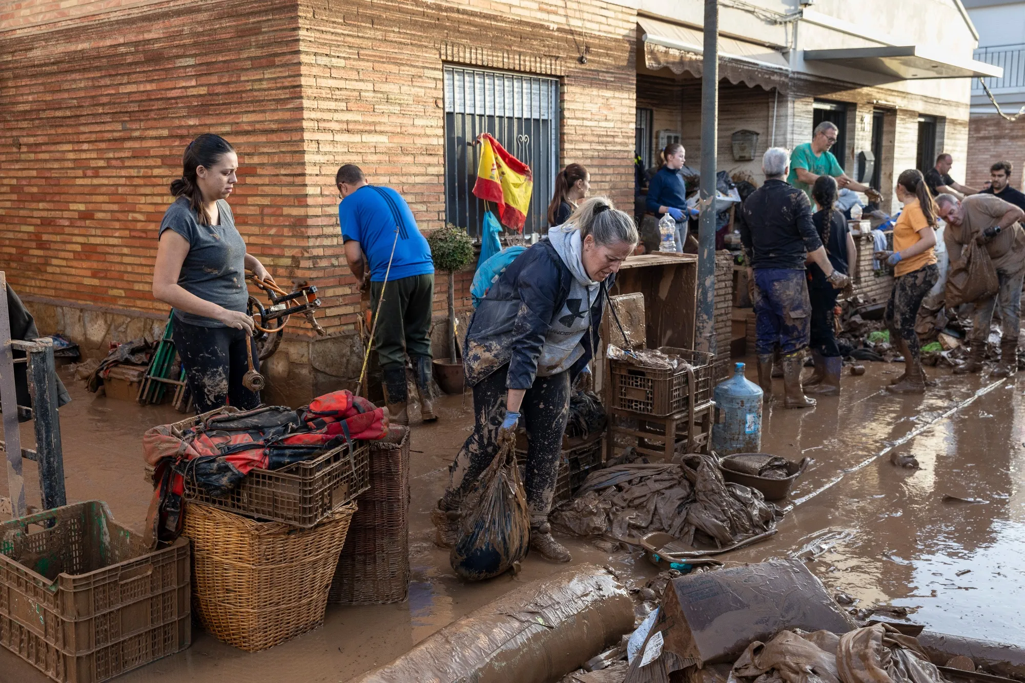 在闪电洪水席卷瓦伦西亚东部小镇乌蒂尔三天后,志愿者们在废墟中艰难前行,帮助清理破损的家具和铲除泥土。
