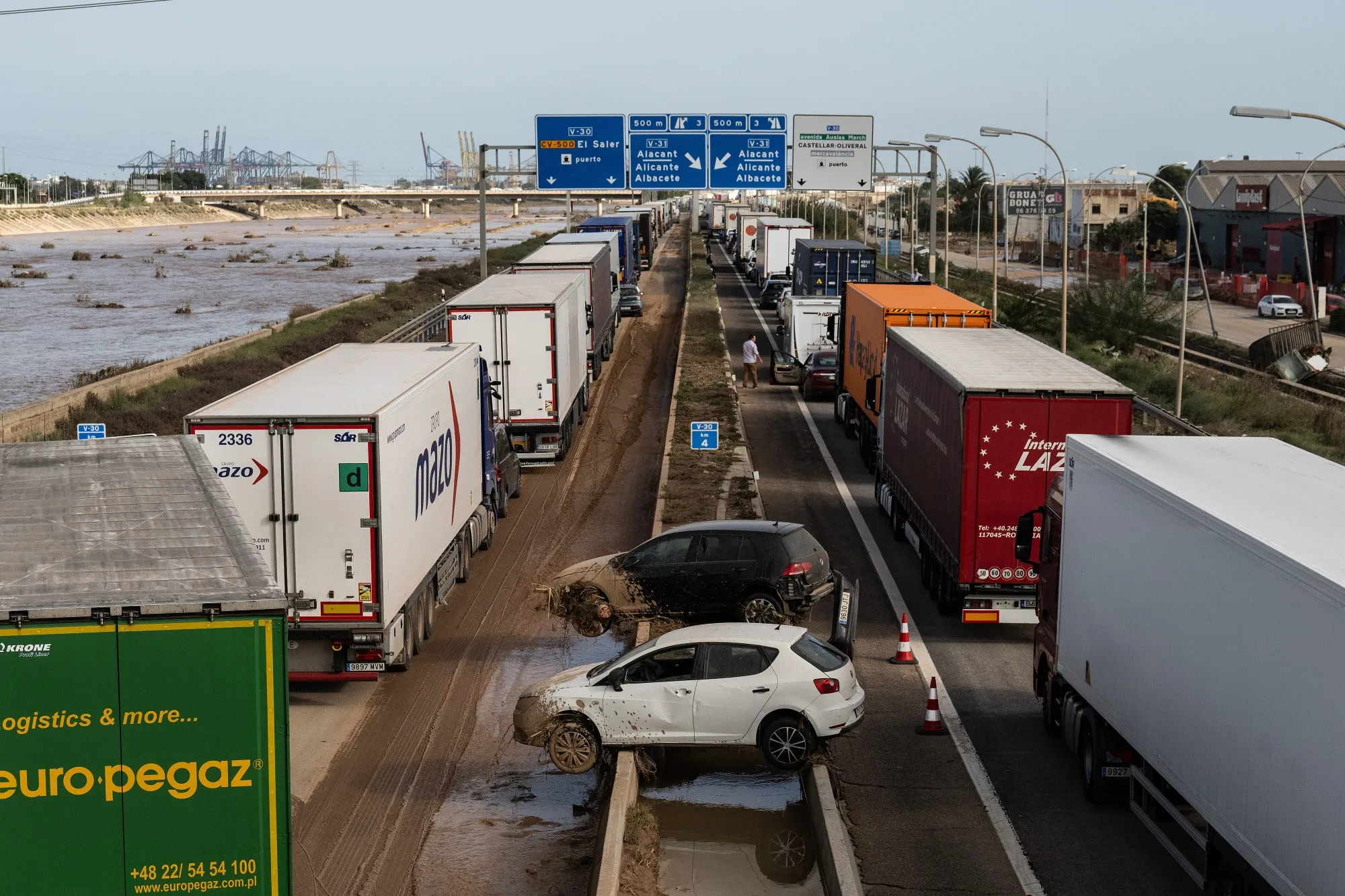 在瓦伦西亚的Paiporta市,暴雨后高速公路上的废弃汽车。摄影师:大卫·拉莫斯/Getty Images