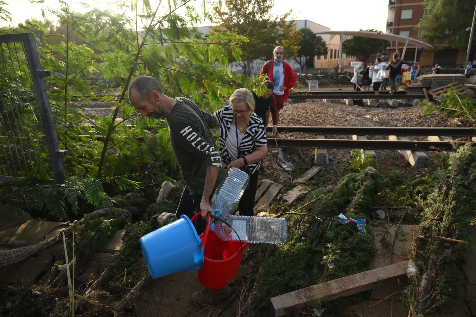 居民们穿越受损的铁路线路去收集水源,地点在Paiporta。摄影师:David Ramos/Getty Images