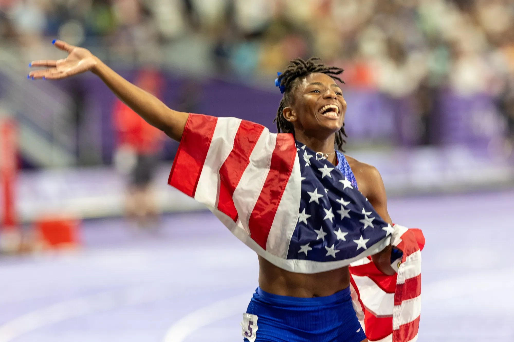 美国的梅丽莎·杰弗逊在2024年8月3日巴黎奥运会女子100米决赛中获得银牌后庆祝。摄影师:安德烈·伊万丘克/努尔照片通过盖蒂图片社### 为2024年制定一种爱国主义