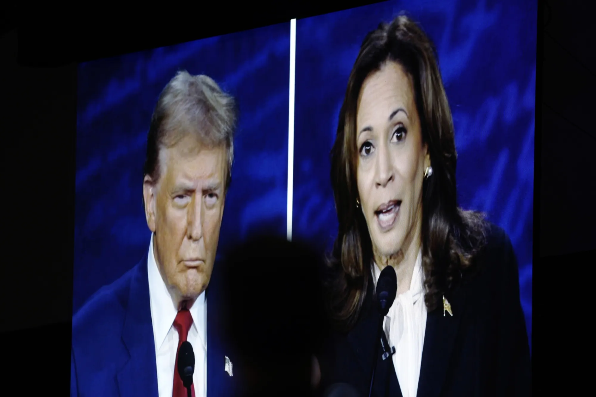 唐纳德·特朗普在屏幕上,左侧,和卡马拉·哈里斯。