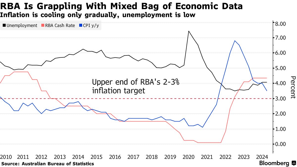 尽管澳大利亚的经济增长乏力,澳大利亚储备银行仍未准备降息,行长米歇尔·布洛克重申,通胀需要“可持续”地保持在2-3%的目标范围内。因此,交易者将降息的定价推迟到了2025年5月,而之前是2月。