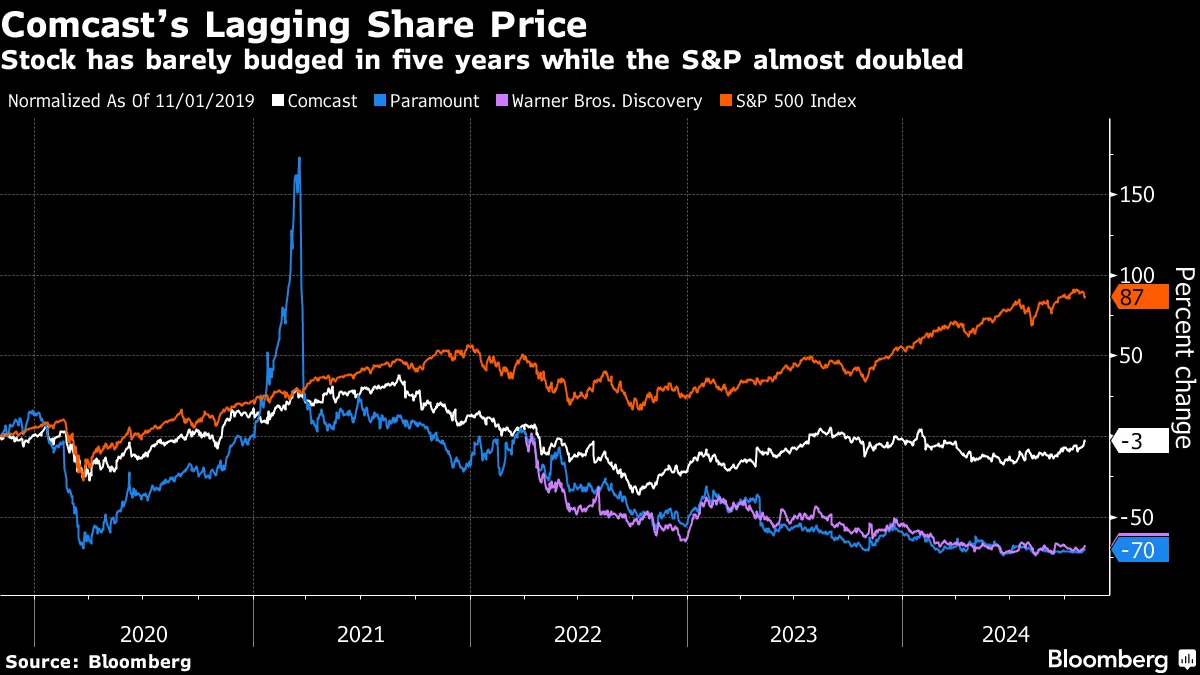 与其他一些媒体公司不同,康卡斯特并没有感到急于做出任何决定。鉴于其规模和家族所有权,它受到华尔街的压力比派拉蒙(自维亚康姆与CBS重聚以来下跌72%)或华纳兄弟(自成立以来几乎下跌70%)要小得多。