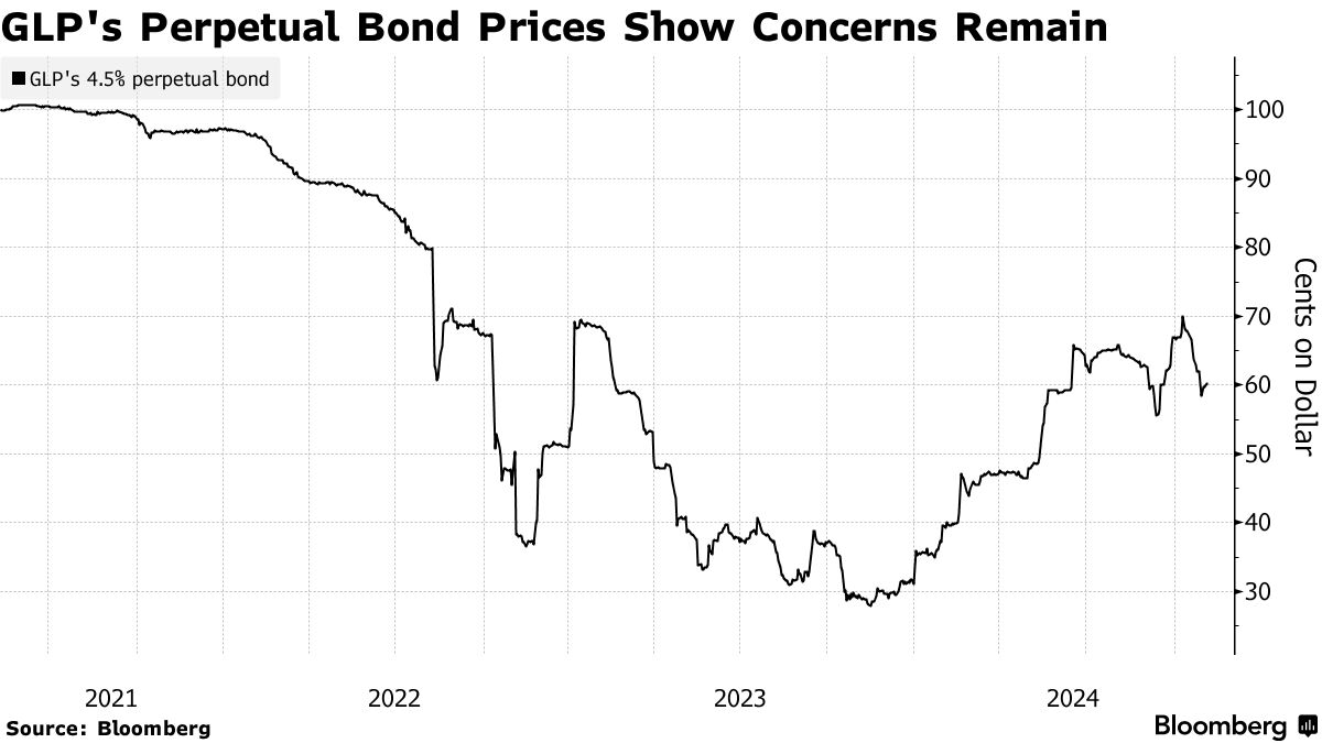 根据彭博社汇编的数据,GLP实体发行的两只永续债券的报价接近60美分,投资者通常认为如果债券交易价格低于70美分,则该债券处于困境中。