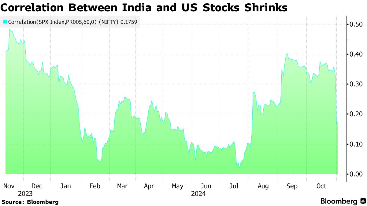 在全球最大经济体关键总统选举前,印度和美国股票之间的短期相关性正在减弱。这意味着任何 民调引发的波动 在美国股市中应该对南亚国家产生 较小的影响。这对投资者来说是个好消息,但对那些依赖波动的交易者来说就没那么好了。也就是说,印度股票在特朗普和拜登总统任期内在美元计价上表现不佳。随着国内经济增长放缓,这一趋势是否会改变尚不确定。