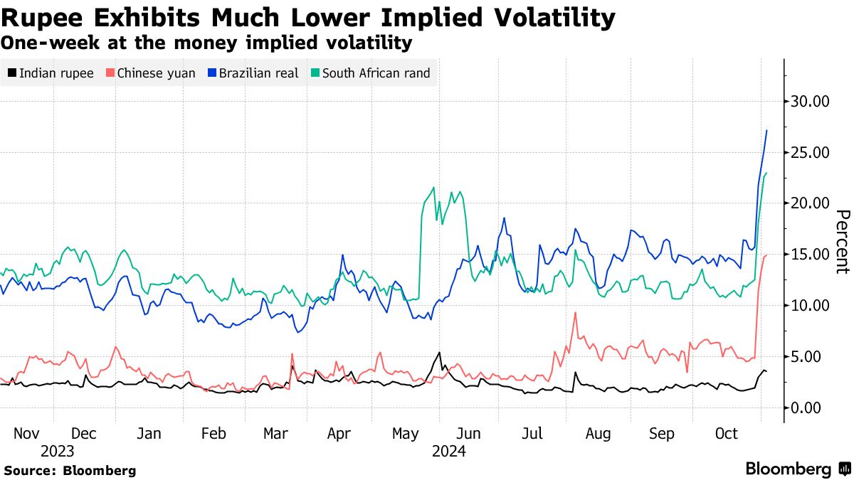 印度储备银行近乎创纪录的外汇储备帮助其保持对卢比的控制,使其不易受到与美国选举相关的波动影响。根据三菱UFJ金融集团(MUFG Bank)的说法,与许多同行不同,卢比对美国关税政策的变化不太敏感,因为印度的经济以国内为导向。