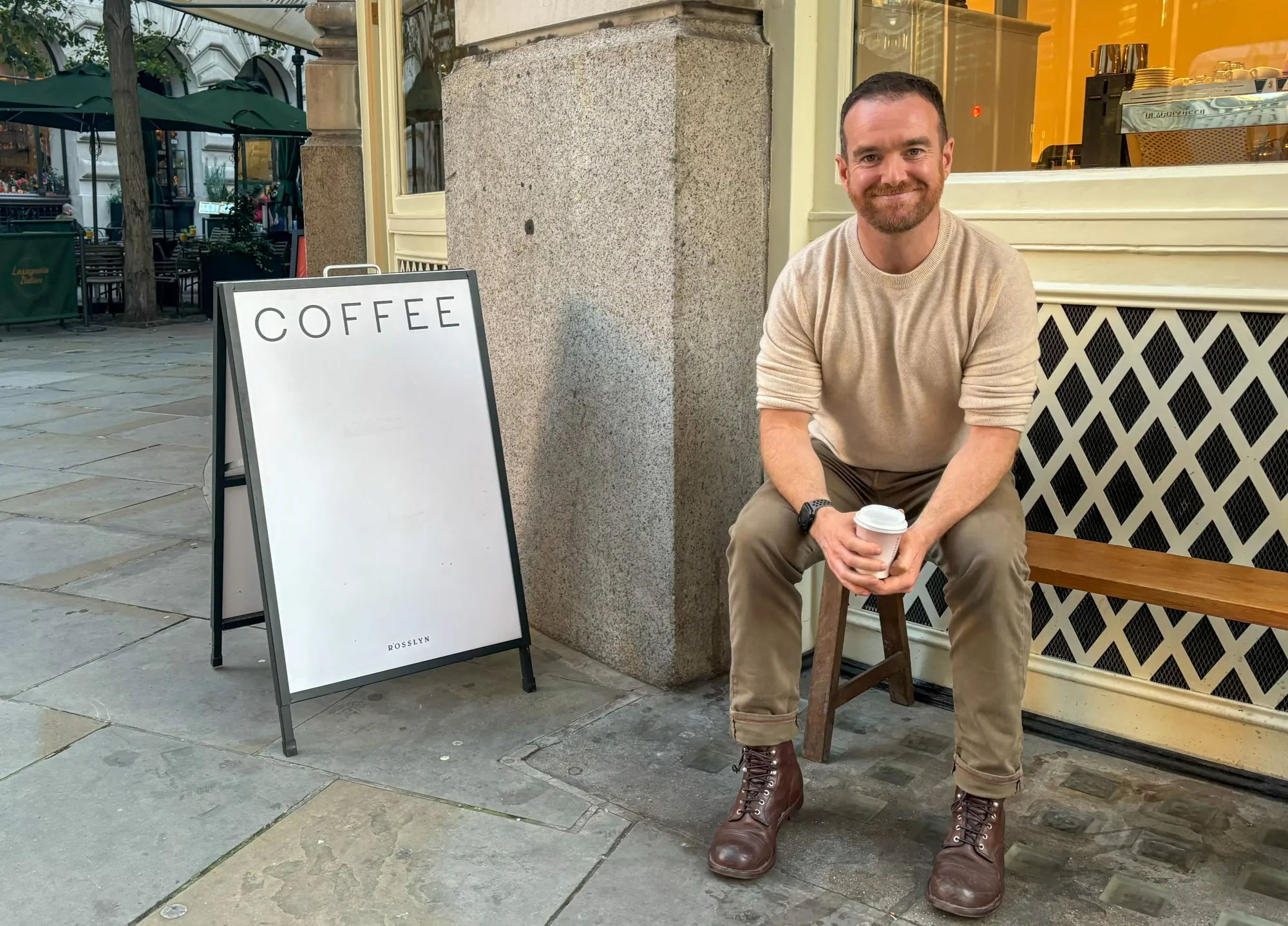 詹姆斯·亨内布里是 罗斯林咖啡 的首席执行官,这是一家在市中心拥有五家特色咖啡店的连锁店。这位爱尔兰人于2018年与他的澳大利亚商业伙伴马特·拉塞尔共同创办了这家公司。我们在皇家交易所分店见面。