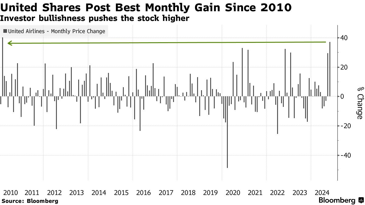 联合航空的股票在十月份上涨了超过37%,这是自2010年2月上涨40%以来的最佳月回报。最近的涨幅推动了联合航空93%的年初至今的涨幅,远超达美航空公司和阿拉斯加航空集团公司,后者分别上涨了44%和24%。如果这种涨幅持续到年底,这将是该股票有记录以来的最佳年度表现。