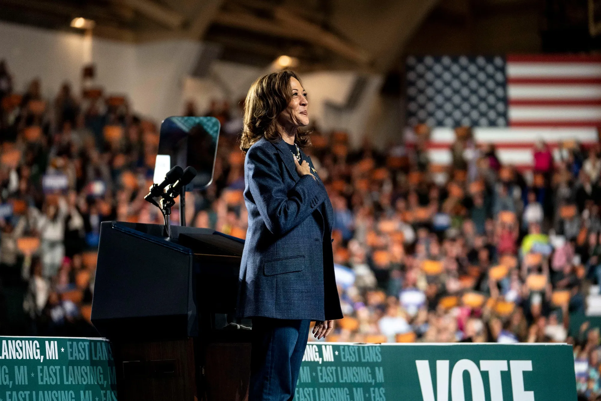 卡马拉·哈里斯在密歇根州东兰辛的密歇根州立大学(MSU)参加竞选活动,时间是11月3日。摄影师:莎拉·赖斯/彭博社晚上,凯蒂·佩里将在匹兹堡与哈里斯共同主持一场集会,随后副总统将前往费城参加最后一场活动,届时将有小辣椒、奥普拉·温弗瑞、里基·马丁和The Roots的出席。该集会将在城市艺术博物馆的台阶前举行,该博物馆因经典电影洛基的训练蒙太奇而闻名。