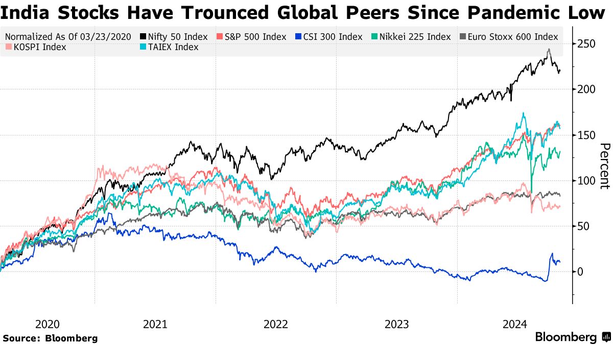 过去几年,印度因其快速的经济增长、激增的企业利润以及更广泛的脱离中国的趋势而成为首选投资目的地。但随着股权估值成为全球最昂贵的之一,经济和盈利的扩张速度放缓,以及中国股票在经历了自九月底以来的刺激措施后开始反弹,这些光环现在开始褪去。