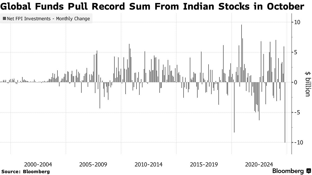 随着外资流出加速,基准NSE Nifty 50指数在10月份下跌了6.2%,创下自2020年3月以来的最差月度表现。根据杰富瑞金融集团的数据,该指数成分股的2025财年收益预估在当前的报告季节中已下调2.2%。