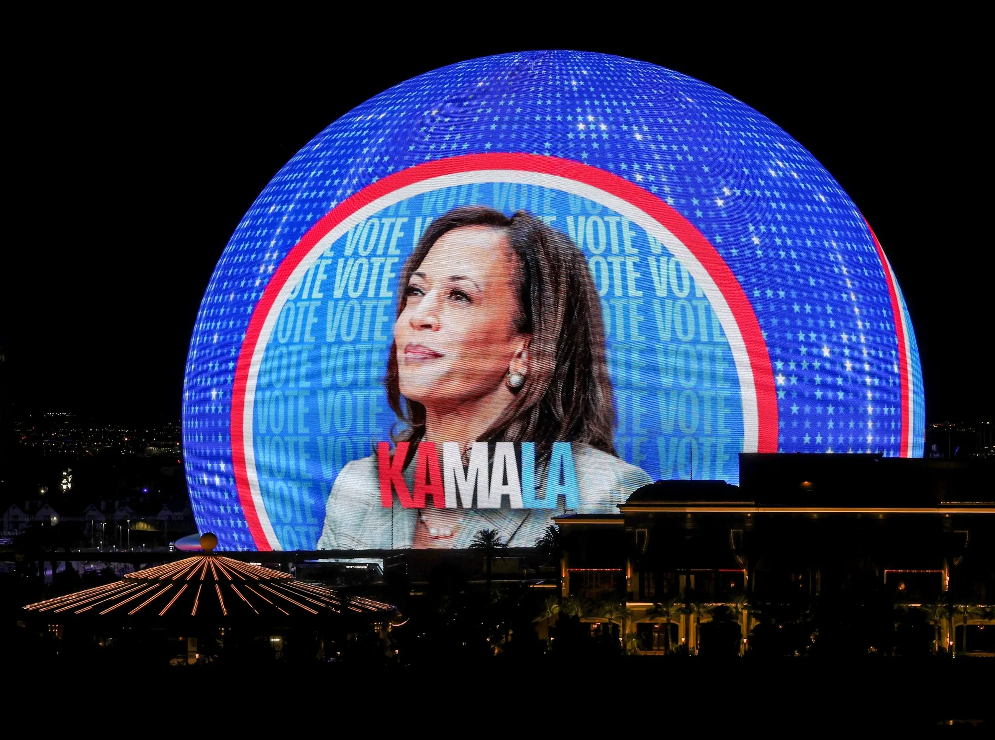 在拉斯维加斯的球体上展示的卡马拉·哈里斯的广告。摄影师:伊桑·米勒/盖蒂图片社“媒体成本更高,” 1-800-Flowers.com的首席执行官吉姆·麦肯说,在他公司最新的电话会议上。“选举确实对我们在数字和传统媒体上支付的费用产生了重大影响。”