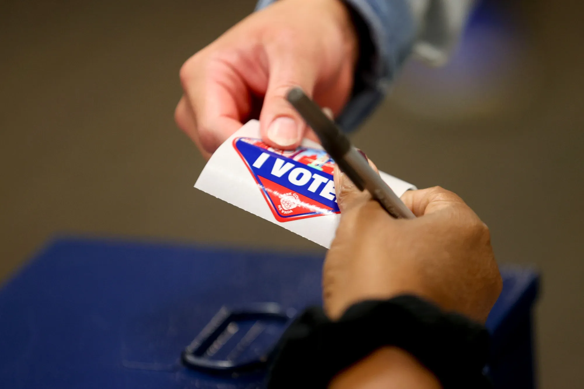 一名投票工作人员在内华达州亨德森的投票地点于11月1日将一张“我投票了”的贴纸递给选民。