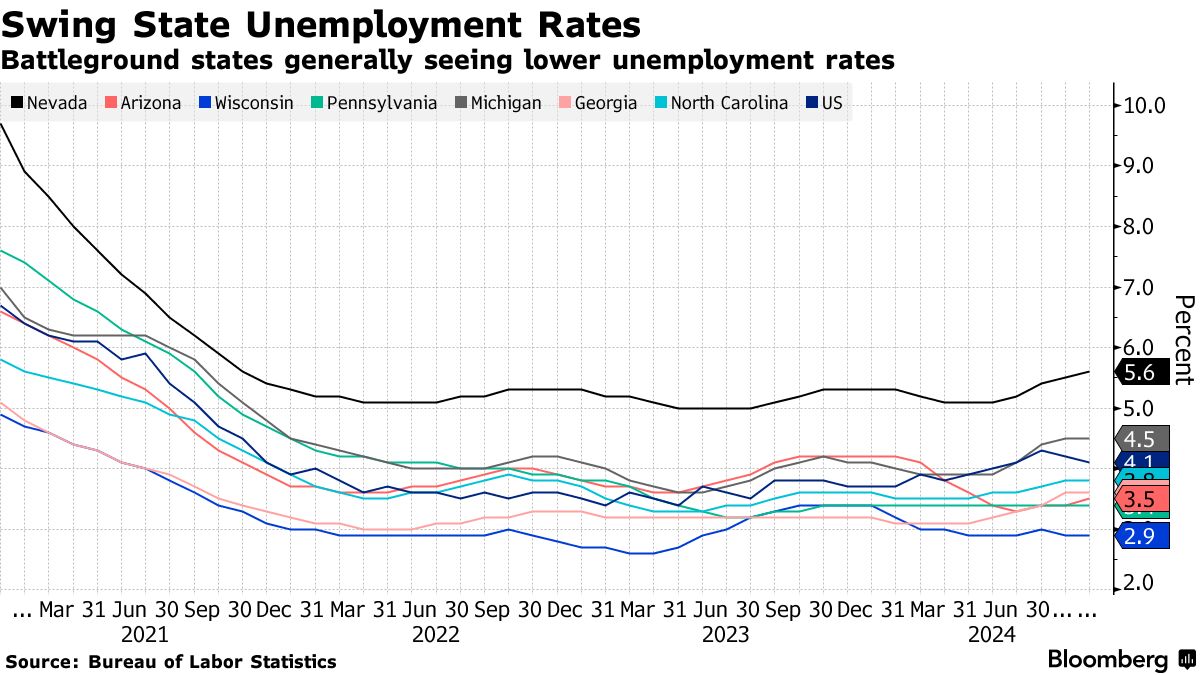 内华达州并不是唯一一个失业率高于全国平均水平的摇摆州。在密歇根州,9月份的失业率为4.5%,而全国为4.1%。