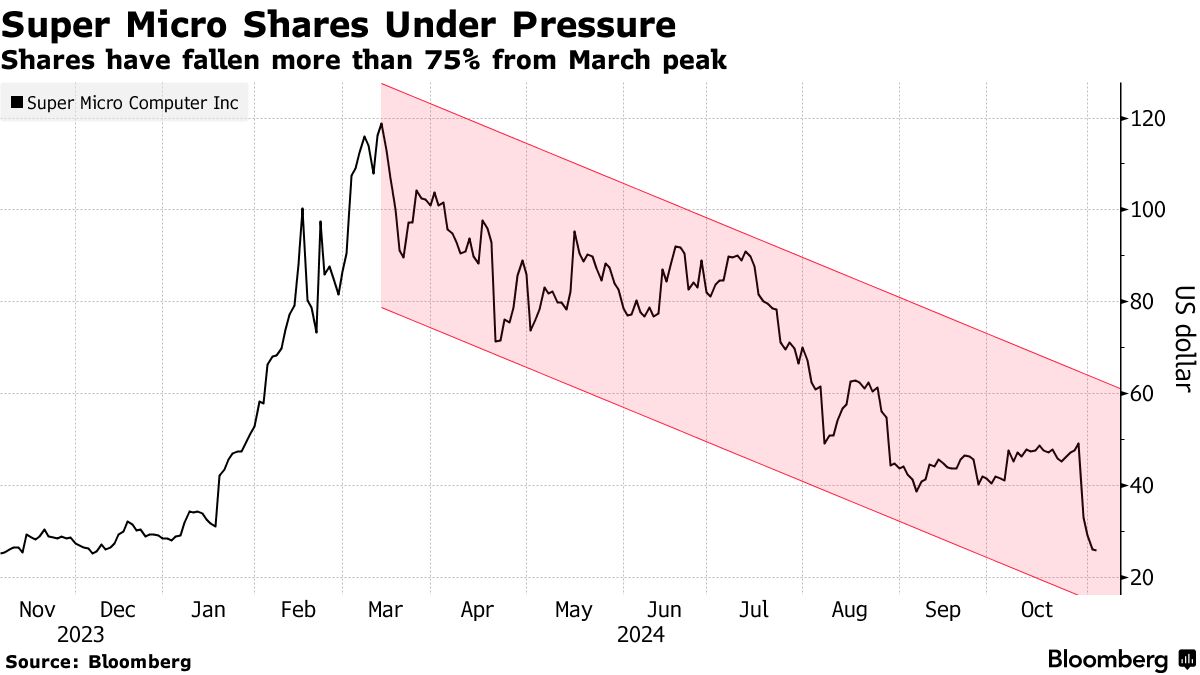超微计算机公司在年初成为热门的人工智能交易。但仅仅在股价创下历史新高的八个月后,投资者开始质疑这家服务器制造商是否会被纳斯达克公司退市,并被从标准普尔500指数中剔除。