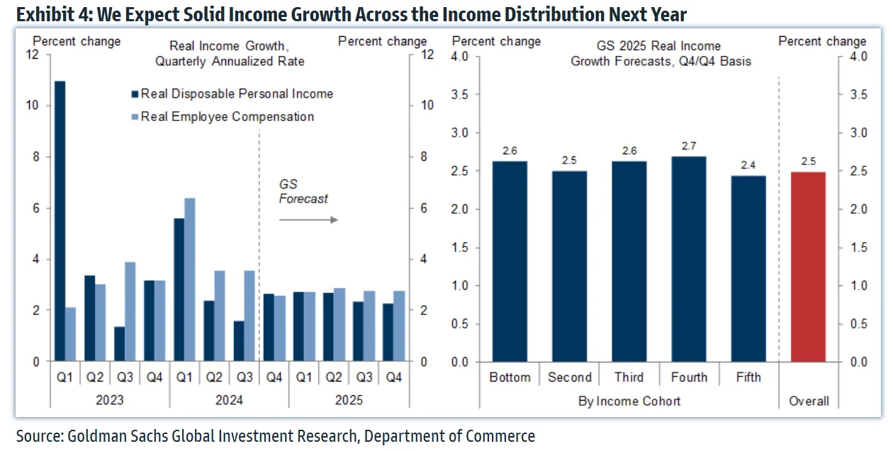美国收入和家庭财富的增长在2025年应保持强劲,推动 消费者支出 增加,这一增幅略低于2024年,高盛经济学家在年度展望中写道。