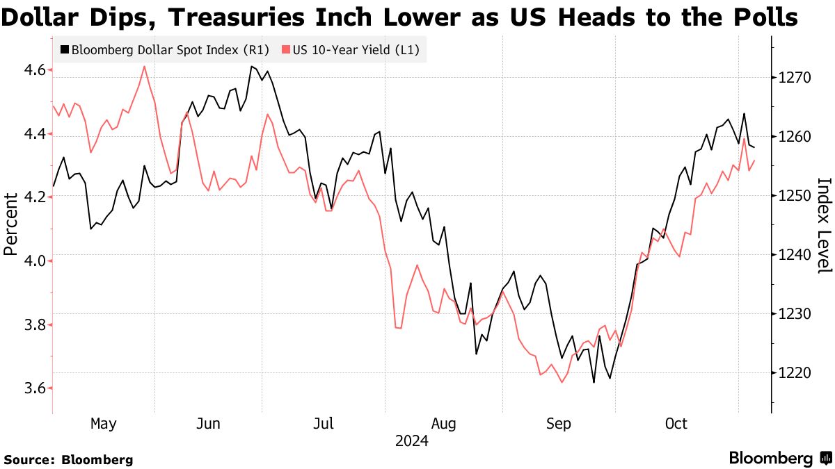 几周以来,博彩市场看好特朗普获胜,交易员们为他的低税和高关税政策可能推动增长和通胀而布局。所谓的特朗普交易使美元升至近四个月来的最高水平,并使10年期国债收益率在上周达到4.38%。