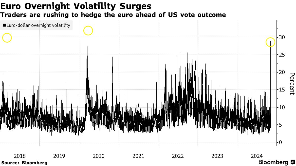 期权交易者也在为欧元的剧烈波动做准备。该货币的隔夜隐含波动率——购买保护以应对即将发生的变动——在周二飙升,并有望迎来自2008年以来最大的日涨幅。