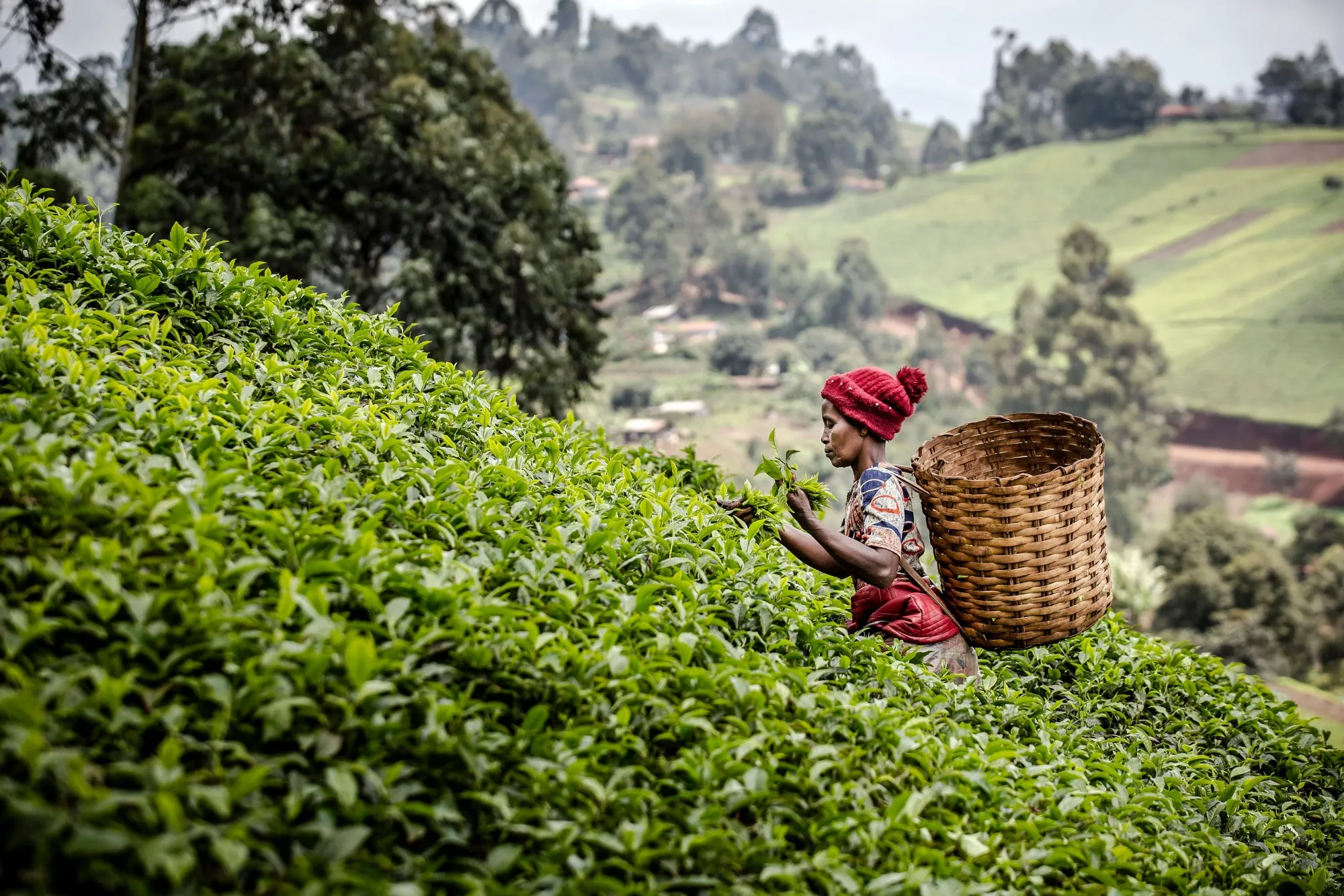 一位女性在肯尼亚穆兰加的茶园采摘茶叶。