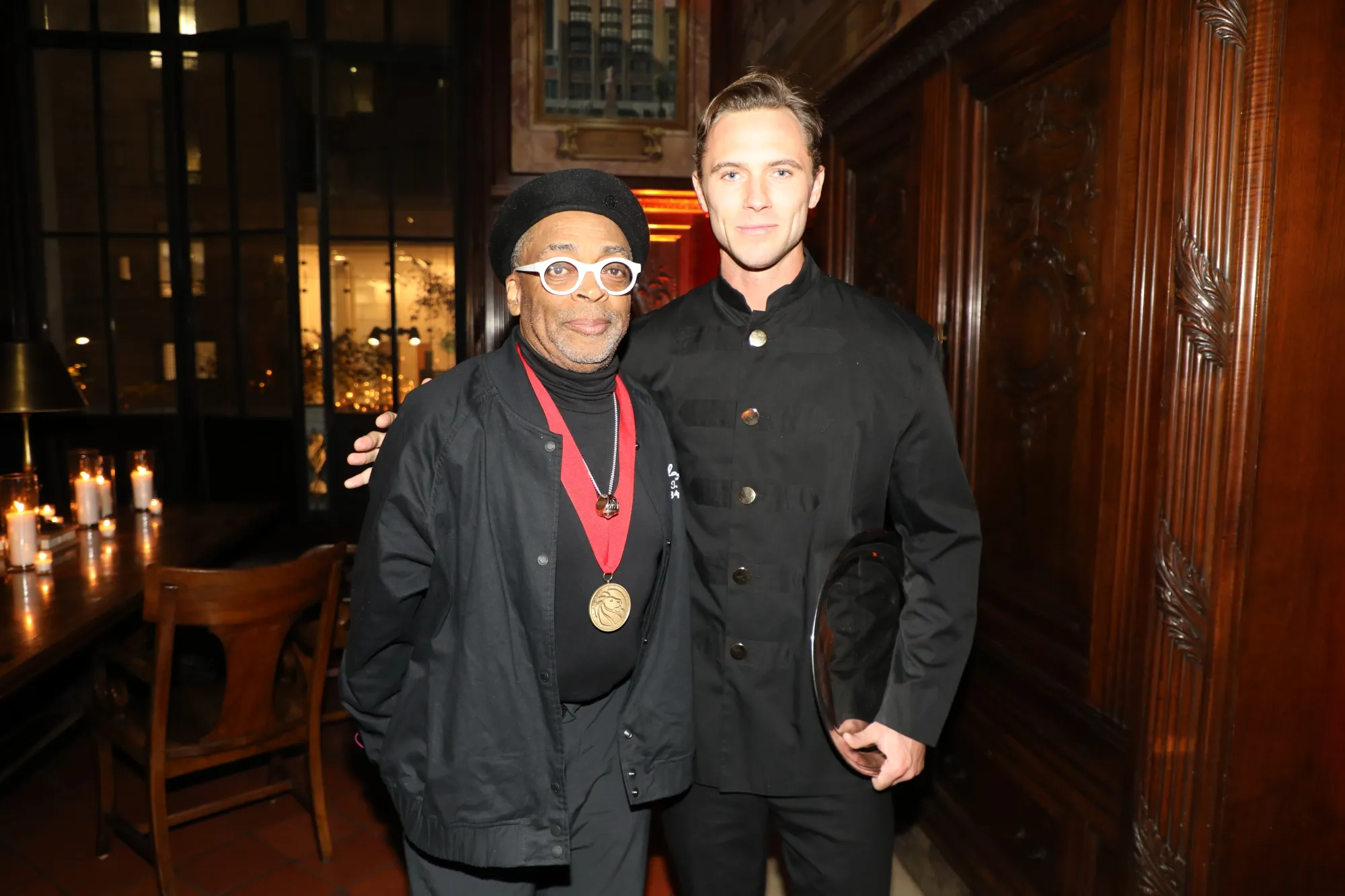 斯派克·李与一名服务员合影。摄影师:阿曼达·戈登/彭博社图书馆董事会主席阿比·米尔斯坦表示,在选举前夜为“民主的基石”筹集资金是合适的。