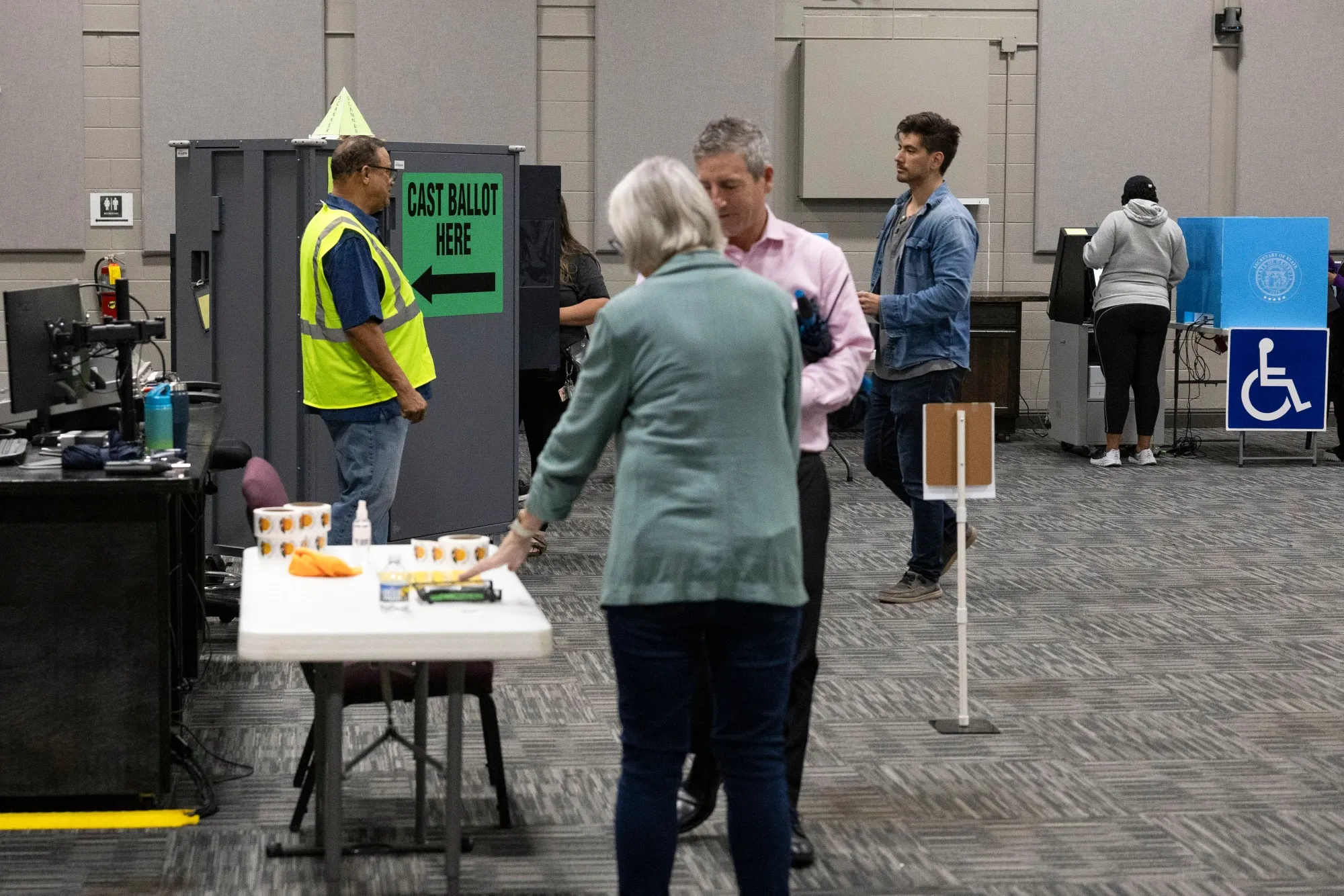 选举官员在乔治亚州斯迈尔纳的国王泉浸信会教堂为2024年总统选举的选民提供帮助。