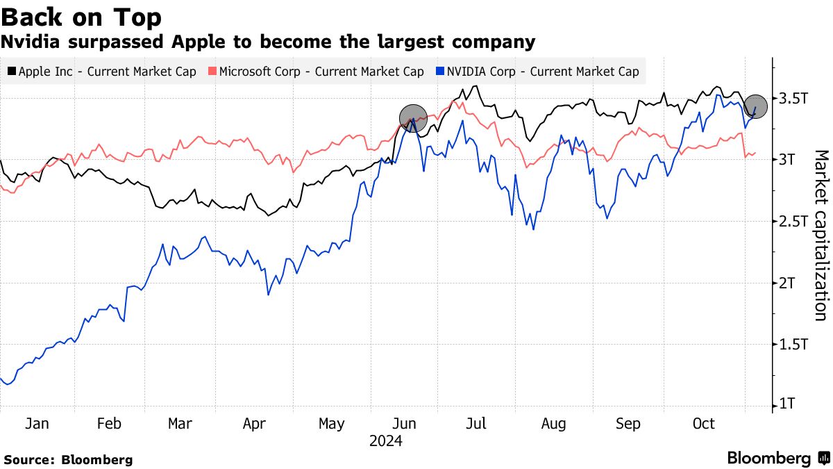 英伟达超越苹果,重新夺回全球市值最高股票位置(NVDA,AAPL) - 彭博社