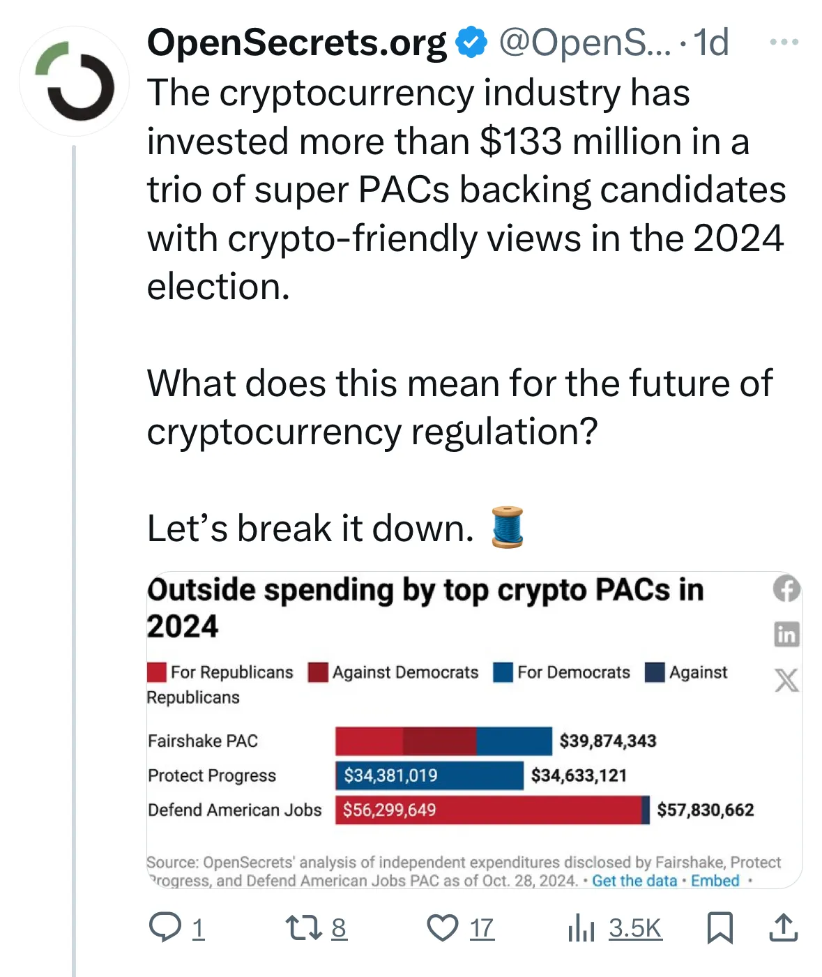然而,行业显然还没有悬挂“任务完成”的横幅。相反,它已经在为下次选举做准备。8月1日,最大的美国加密货币交易所Coinbase Global Inc.表示,它将某些政策费用转移到“一般和行政”类别,因为预计这些费用在选举后仍将继续。然后上周,Coinbase承诺向Fairshake PAC投入2500万美元,以支持2026年中期选举中的亲加密货币国会候选人。周一,风险投资公司a16z 紧随其后,承诺向Fairshake投入超过2300万美元用于中期选举。