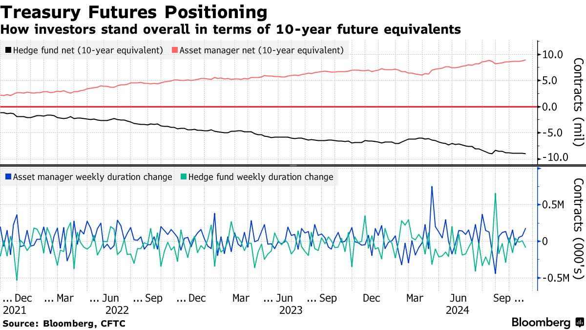 资产管理者在截至10月29日的一周内增加了约182,000个10年期国债期货等值的净多头头寸,根据商品期货交易委员会的数据。相反,对冲基金在同一报告期内将净空头头寸扩大了约86,000个10年期国债期货等值。资产管理者最大的持仓变化出现在5年期国债期货中,净多头在风险上每基点增加了870万美元。